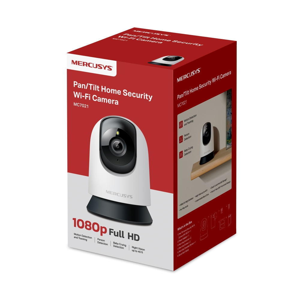 †microSD card sold separately. ‡Subscribe for cloud storage at https://www.mercusys.com/cameracare/ §MC7021 does not have an Ethernet port and can only be connected via Wi-Fi. △Compatible with Alexa and Google Assistant supported displays. User experience is dependent on the connected device's specifications. ☆The maximum supported video frame rate depends on local power supply specifications. In regions with 60 Hz power, up to 30 FPS can be achieved; in regions with 50 Hz power, the maximum is 25 FPS.